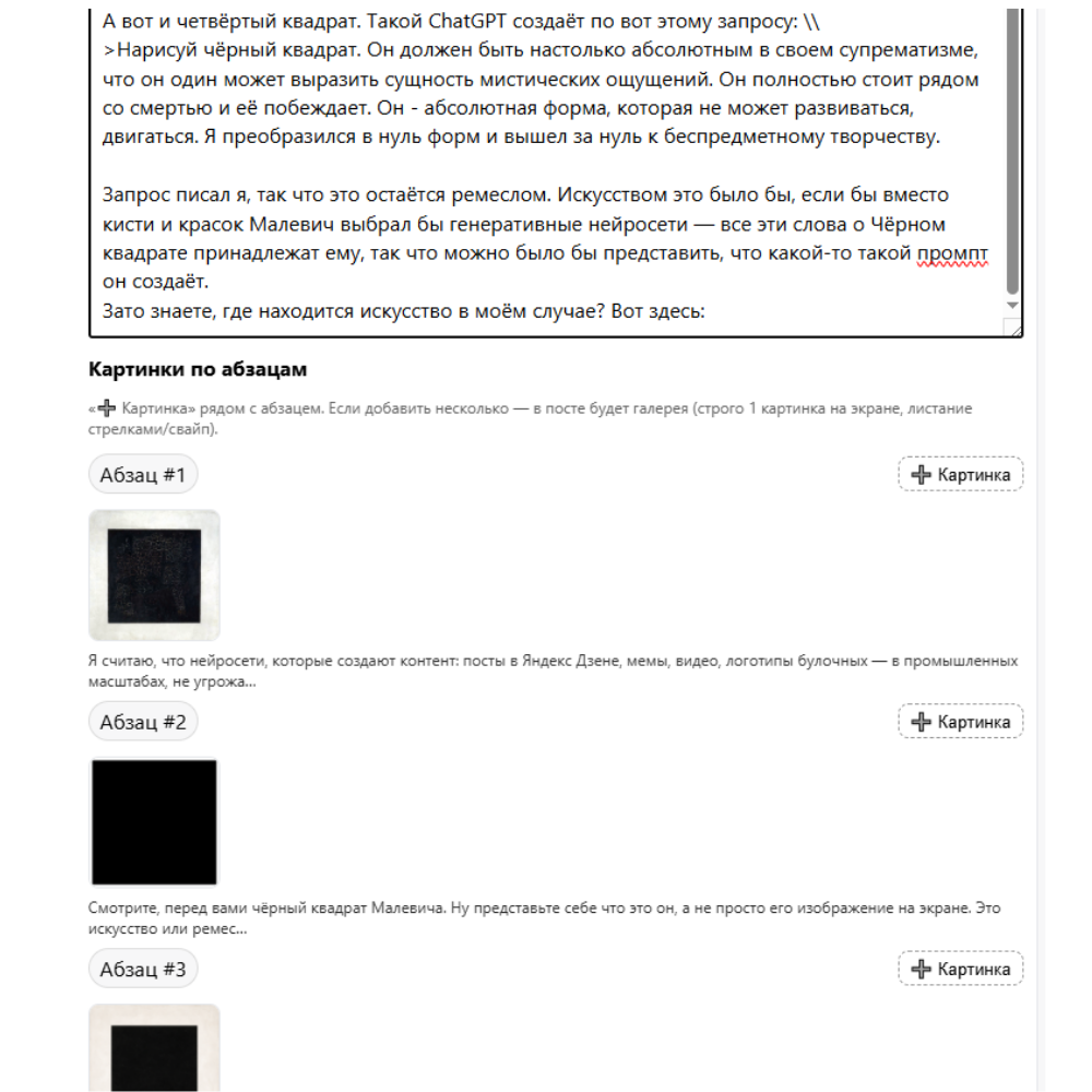 Есть и третий чёрный квадрат — его создал по моему запросу ChatGPT. Ремесло. Я просто сказал — сделай чёрный квадрат как у Малевича. И он сделал.